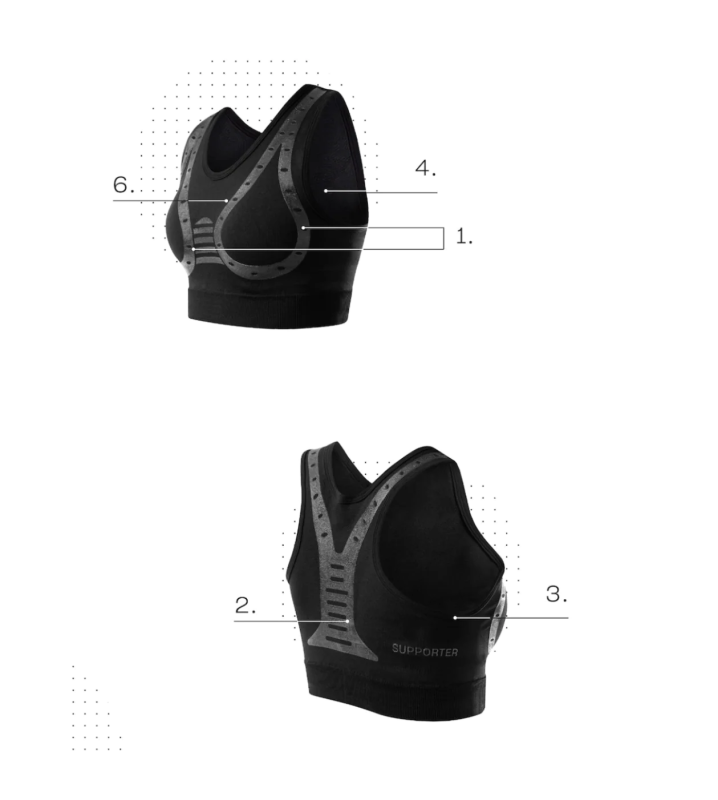 SUPPORTER is the first biomechanical bra designed to support the breast and reduce fatigue in the pectoral and back muscles during physical activity and daily life. Main benefits: