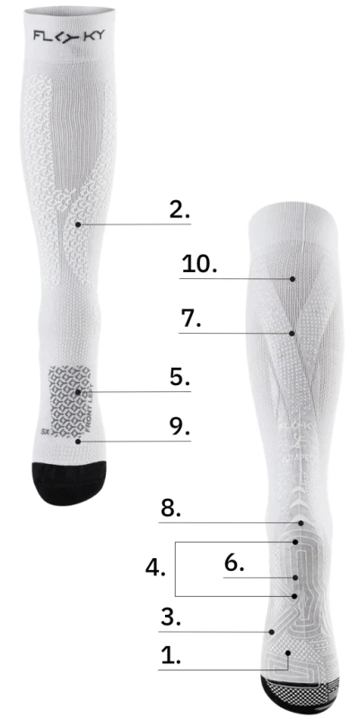 The silk-screened silicone support located in the root area of the metatarsal heads improves drive during the jumping phase, guaranteeing a increased potency, due to the full transformation of energy, and decreases vibrations during the fall phase, protecting the muscle and tendon parts.