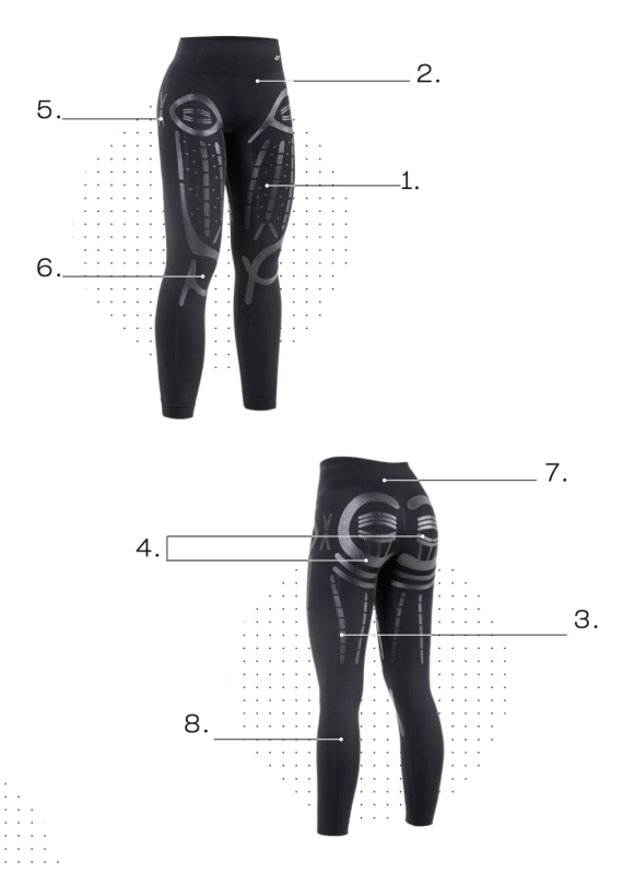 The silicone prints that cross at the head of the trochanter provide greater stabilization, preventing inflammation of the intra- and extra-rotator muscles of the hip.